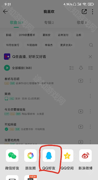 1、打开QQ音乐,打开我喜欢的列表,点击右上角分享;