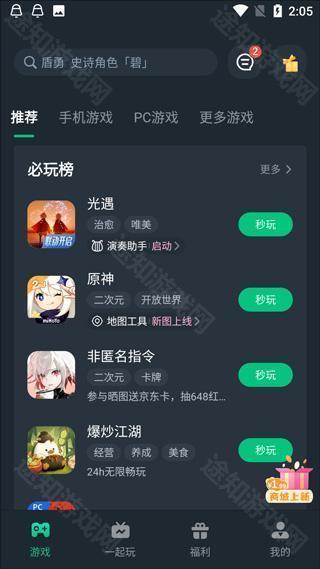 2、在游戏界面找到自己想玩的游戏,如光遇,点击“秒完”。