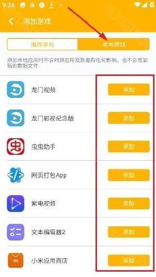 3. 系统将会罗列出手机内所有已经安装的应用,从中选择需要进行映射操作的本地游戏并添加即可。