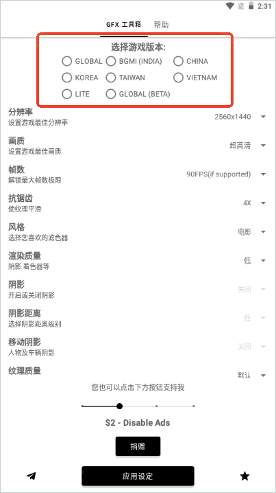 1、打开gfx工具箱,这时候要选择你玩的吃鸡游戏版本了;
