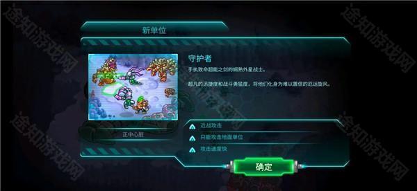 守卫者,超强的近战输出单位,高攻速,无视护甲,自带突进,一流的进攻能力,攀出科技后身板尚可,如果有外交官辅助的话战斗力及其强悍,缺点是不能对空。另外其跳跃的特殊攻击可以短距离地无视地形突击敌人,并可以同时对几个单位造成伤害,非常好用;移速尚可,无视护甲加上高攻速的特性使其成为boss杀手以及大型单位的噩梦,高护甲?血厚?不存在的。