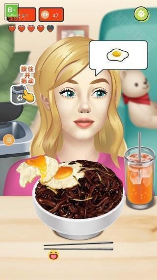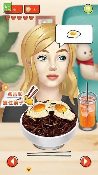 夹起食物,送到女主播的口中,如果当中美食不慎掉落需要拖动的垃圾箱扔掉。