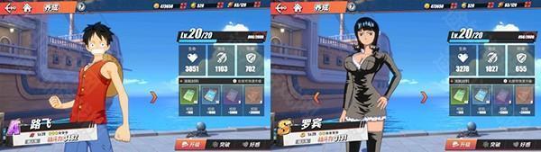 游戏中玩家提升战力的方式除了给予角色经验提升等级外,还需要进行“突破”。角色每突破提升一颗星级,则会相应的提升各项属性的成长值。而在本作中玩家前期跟随并完成任务,可以获得数量不俗的,路飞的角色碎片。而这些碎片可以使玩家轻松将路飞提升至三星,在游戏的前期拥有不输S级角色的高属性值与战力。