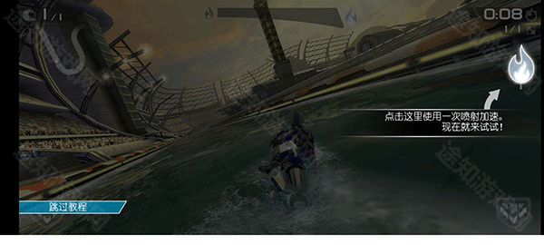3、轻触屏幕下方的两个下箭头之一即可让摩托艇制动,不过一般情况下很少用到。