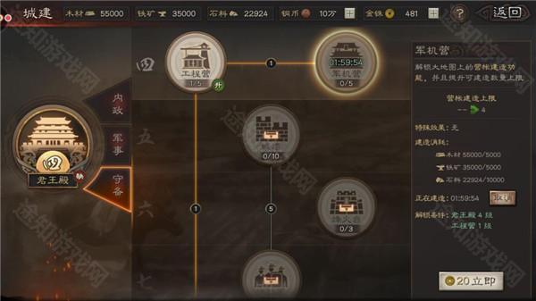 军机营:解锁大地图上的营帐建造功能,并且提升可建造营帐上限,要求君王殿四级,工程营一级