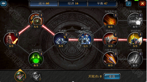 战斗天赋的加点,战斗一栏主要是对各个兵种及对整体伤害的属性加成,在这里面步兵防御和步兵生命是很重要的,步兵承受伤害,几乎对方所有攻击都要由步兵来抗,步兵不光,其他兵是不会死多少的,所以建议大家把所有加步兵生命、防御、伤害的全部加满。没有步兵栏的就加骑兵和弓箭手的防御和攻击,最重要的一点不要所有的都加着走,一般一路往下加就可以了,因为越到后面天赋点需要的越多,所有加着走肯定加不了多少,一般领主到45级以上的玩家建议一路加到生命保护术,因为开着生命保护术打人可以加30%的劫后余生。