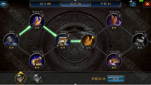 平衡天赋的加点,平衡天赋在发展过程中起着很大作用,因为它在发育时对各个建筑的属性加成包括医院容量、训练速度和其他很多地方都有加速和提升。这个加点也建议全部往后面加。加点稍微复杂的就是战斗天赋的加成,另外一点大家记得注意使用天赋技能,比如使用立即生产立马从城里田中收取五小时采集量,使用三秒回兵坑打你的人这些都是很实用的技能。
