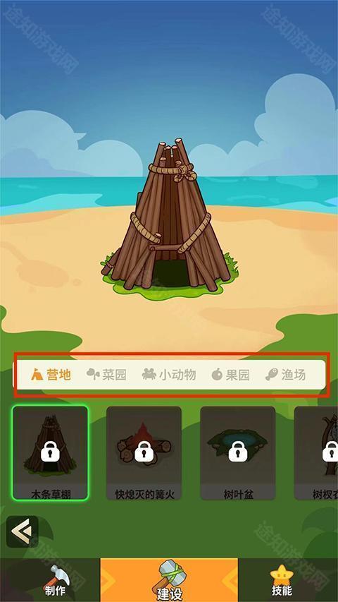 7、在建设栏目,你可以建设营地、菜园、小动物、果园和渔场,