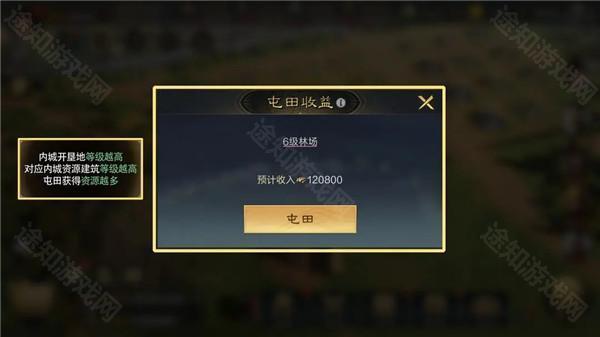 3、屯田:根据当前内城开垦地的等级与类型,获得相应的资源。