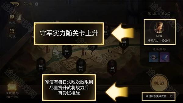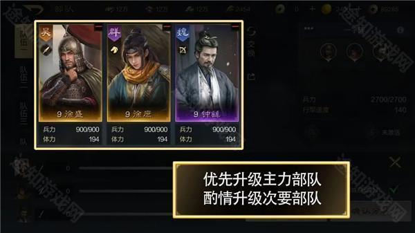 3、注重武将等级提升。前期升级武将等级至关重要,优先使用道具、铜币升级主力部队,保证阵容强度,如果开荒无压力,也可以酌情培养二队,以加快发育速度。