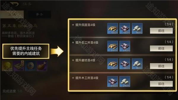 5、前期以完成主线任务为目标,因此,应综合考虑任务需求与资源投入,合理规划资源储存。在资源充足时,优先升级完成主线任务所需要的内城建筑!