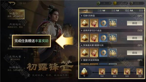 9、积极完成新手活动任务。在游戏中活动任务往往配有丰厚的奖励,建议主公时刻留意这些任务,并积极参与以完成它们,以获得更多的资源,加速主公的发展。