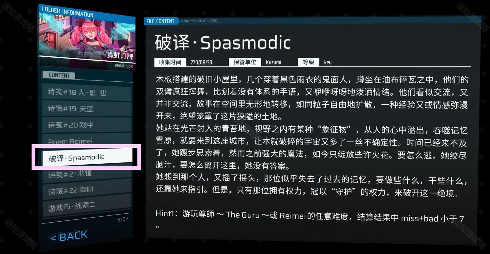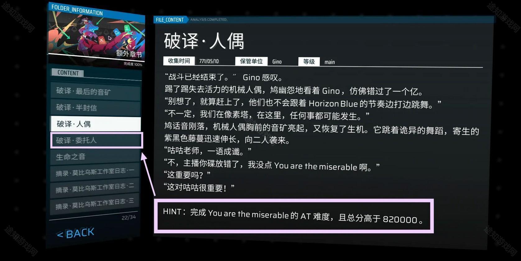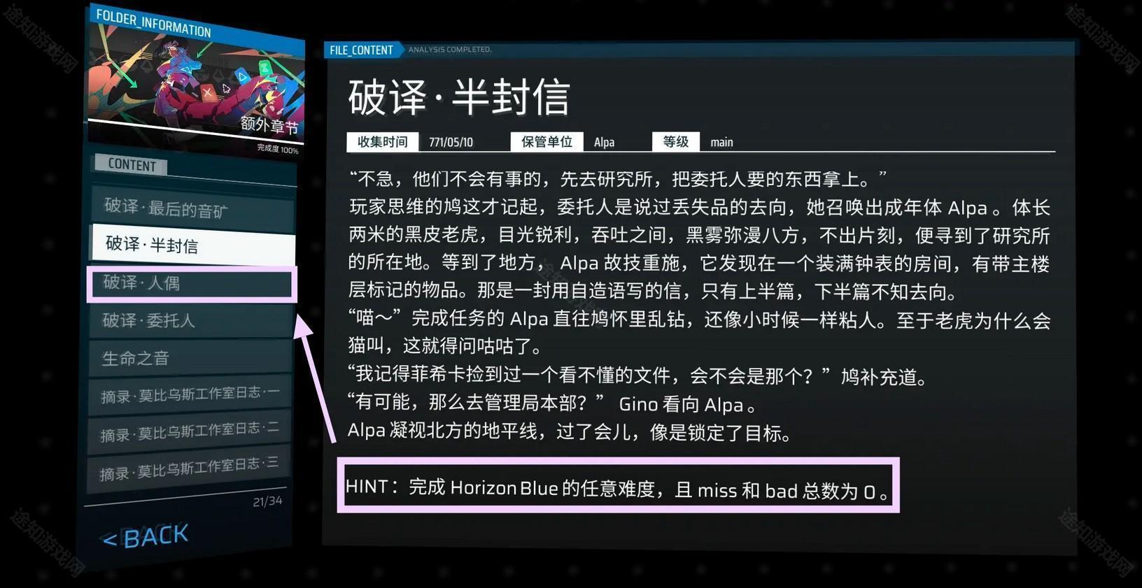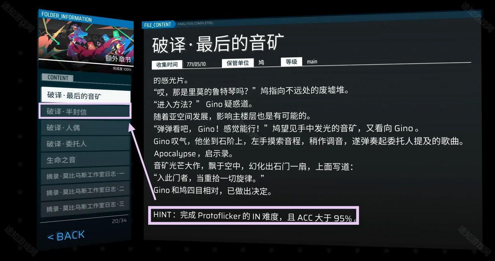 注:「破译·最后的音矿」只需要游玩该章节默认解锁的第一首歌就会掉落,只有这个掉了之后才能跟着去做后面的解谜