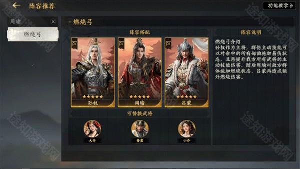 如主流弓兵队伍燃烧弓,孙权作为主将,群伤主动技能可以对命中的所有部曲施加易伤状态,且再提升我方所有武将的主动技能伤害,随后周瑜对敌方群体施加燃烧状态,吕蒙再造成额外燃烧伤害。