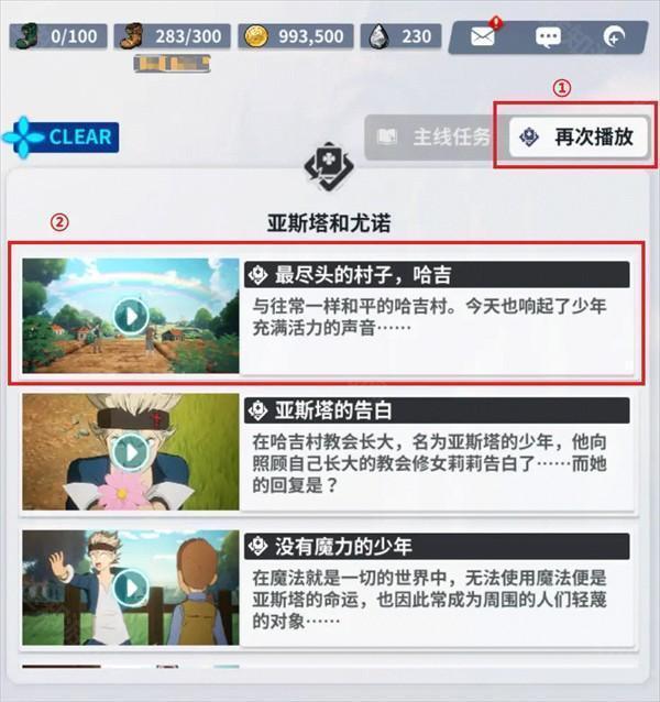 如果魔导士大人想回忆冒险中的精彩瞬间的话,可以点击①「再次播放」按钮,查看可播放的所有剧情视频目录,再点击②「想要观看的视频」,再次观看美好的剧情故事~