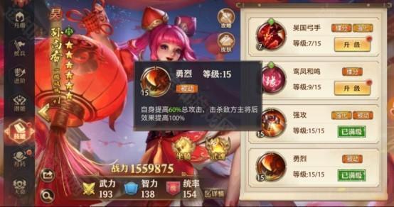 孙尚香作为主力输出,主要是因为4技能勇烈,自身加攻击,并且击杀地方主将效果提升100%。