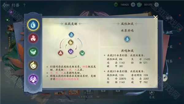 幻兽存在不同属性,每种属性主动释放的技能会对敌方单位挂上对应的元素buff,不同属性的元素buff结合在一起会产生特殊效果。