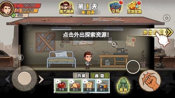 1、进入求生一百天破解版游戏后,点击外出探索,寻找资源。