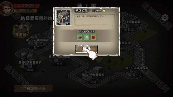 2、接着选择要探索的地点,新人玩家根据新手教学引导,开始探索单身公寓。