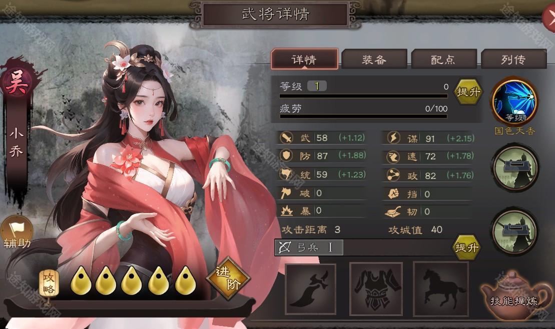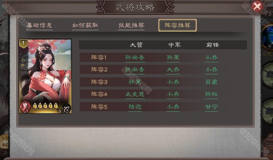 武将缘分:“吴国女将”(与大乔、孙尚香等 2 人组队加谋防),是吴国阵容核心 buff。