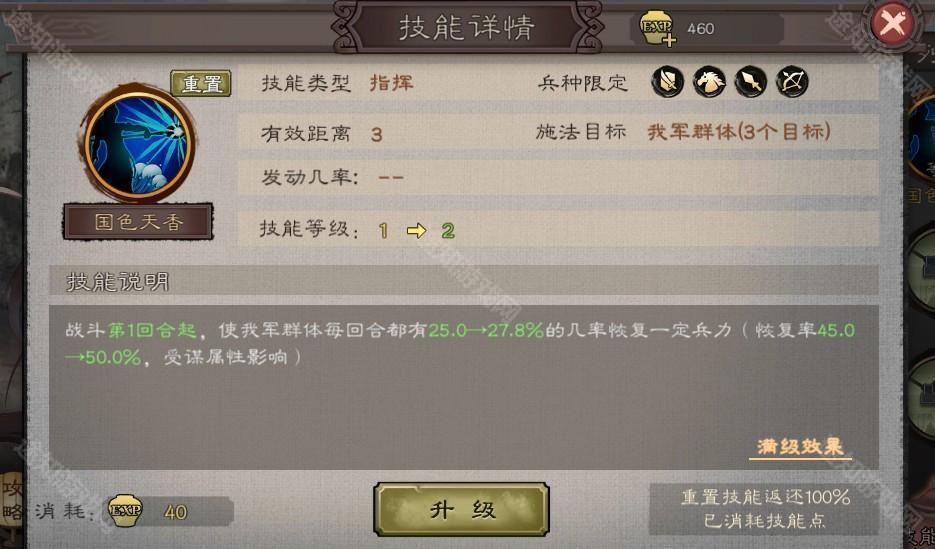 效果:战斗第 1 回合起,我军群体每回合 50% 几率回血,恢复率满级 90%(受谋属性加成)。