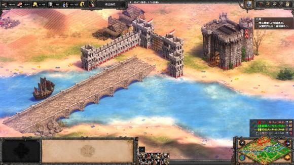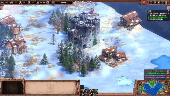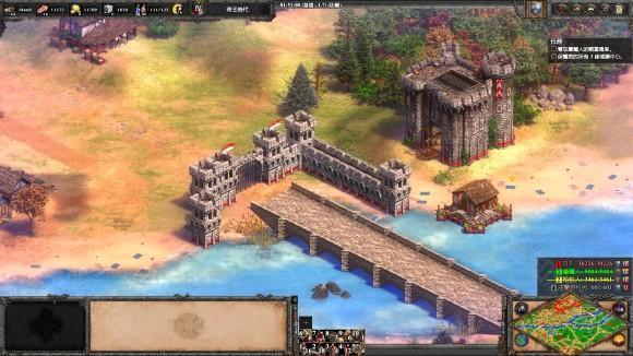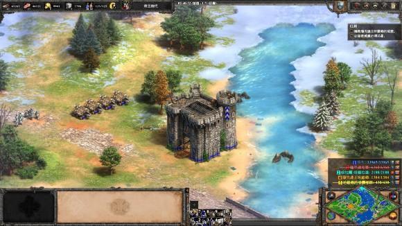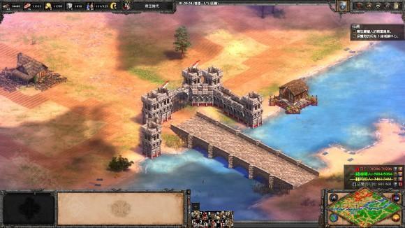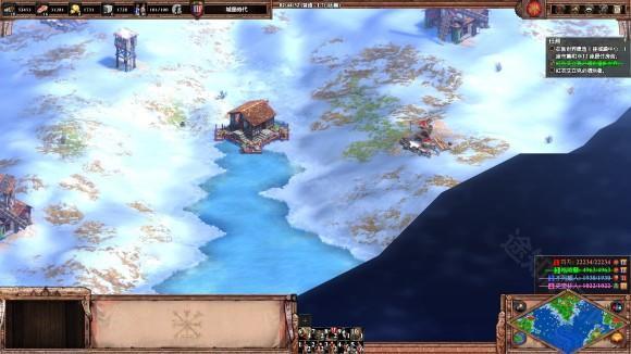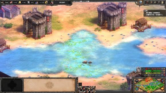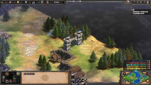 3、 建城墙把三座桥封死, 然后升城堡时代到9点中的浅滩造两座城堡, 发育一段时间后就可以反攻了。 两个敌人都没什么守军, 城堡时代就可将迦菲奇杀死, 然后攻克摩尔人的阵地, 把车领出来, 送回家过关。