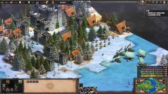 4、然后在格陵兰岛西岸新建船坞和运输船,准备登陆文兰在8点钟方向有一小岛, 岛上有个英雄叫伯德, 是一个开发者的名字, 把他收了 (老版只能杀死), 带着大军登陆纽芬兰岛。 先建个城堡, 然后把岛上的阿尔冈昆武士 (本质是靛蓝突袭者) 和民兵都吸引到城堡底下解决, 然后不需要盖什么房子TC的, 直接派兵把紫色原住民的TC和兵营拆除即可胜利。
