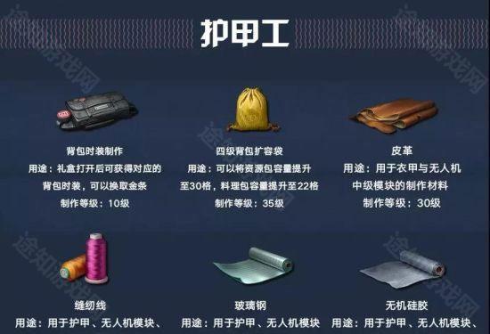 背包时装制作、皮革制作术、4级背包扩容袋、缝纫线制作术、护甲福至心灵、无机硅胶。