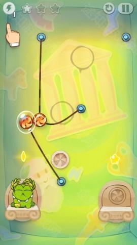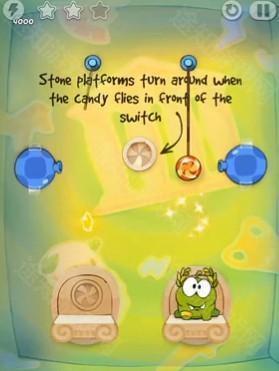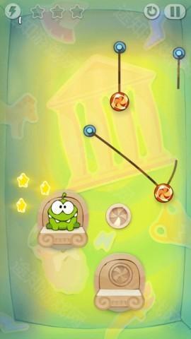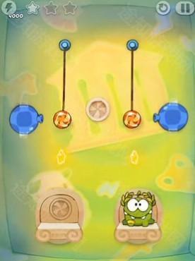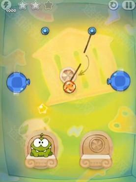 第一步:首先割断右上角的绳子,然后等怪物翻进去的时候第一个圈圈就可以吃掉左边的星星。