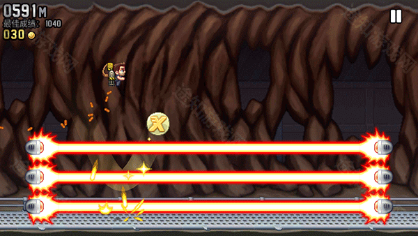 2、轻触任何位置开始游戏,点击屏幕人物就会往上飞,当不点屏幕就会降下,依据金币和道具的位置来进行调节,游戏而类似于像素鸟的玩法,但还加入了射击功能。期间遇到有电流的障碍,需要躲避。