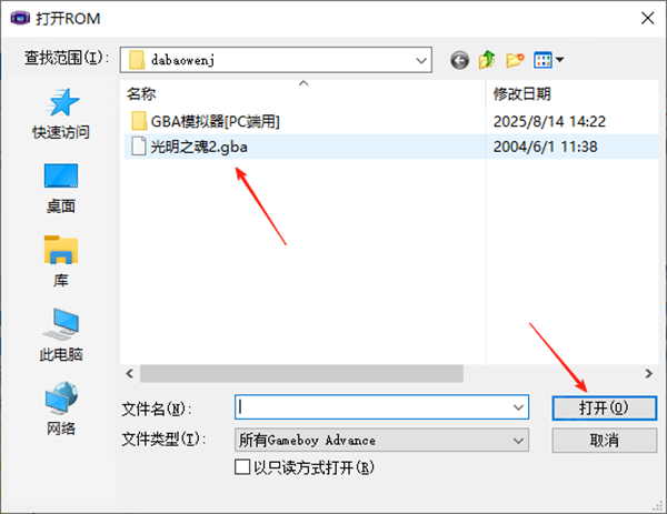 1、解压后,得到GBA模拟器,和光明之魂2游戏文件;