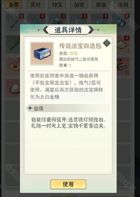 2、法宝升级优先升级修为法宝,因为游戏里太白的获取很少,所以有些法宝可以不升级。