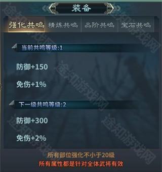 全部装备每强化达到10级可以获得一个共鸣等级,强化共鸣属性是增加防御以及免伤,随着共鸣等级提升。