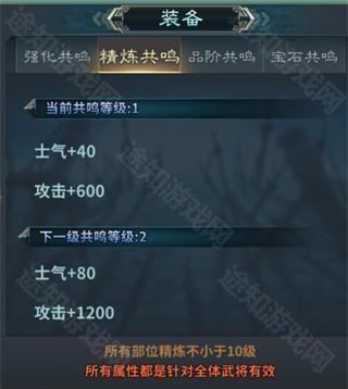 2、精炼:可以使用金油来精炼装备,精炼石可以通过一夫当关、商店购买、充值礼包、寻宝充值商店等途径获取,全部精炼每提升5级可以获得一个共鸣等级,精炼共鸣属性是增加士气以及攻击,随着共鸣等级提升。