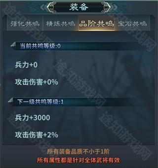 4、品阶共鸣:不同颜色的装备穿戴一套,可以激活共鸣等级属性,主要加兵力和攻击伤害加成属性,白色对应1级,以此类推。