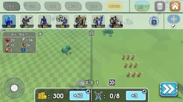 2、游戏的操作很简单,单人战役为闯关的玩法,进入游戏后可以看到敌方的阵营情况,你可以依次来部署你的队伍,只需点击上方的任一兵种,再点击空白位置,就可以将该兵种部署在此地,再次点击则可以取消本次部署。