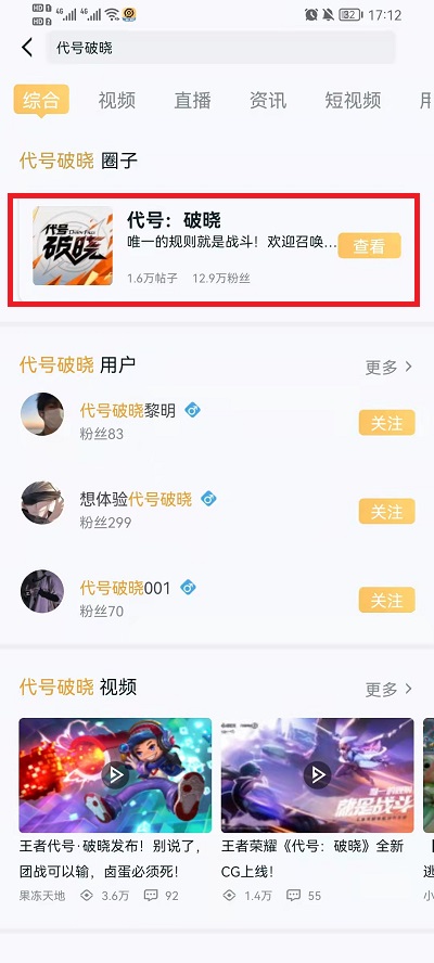 1、可以通过王者营地去进行账号资格申请,下载王者营地,进入到软件中,在首页界面点击右上角的搜索输入【代号破晓】就可以看到代号破晓的圈子,点击进入圈子;