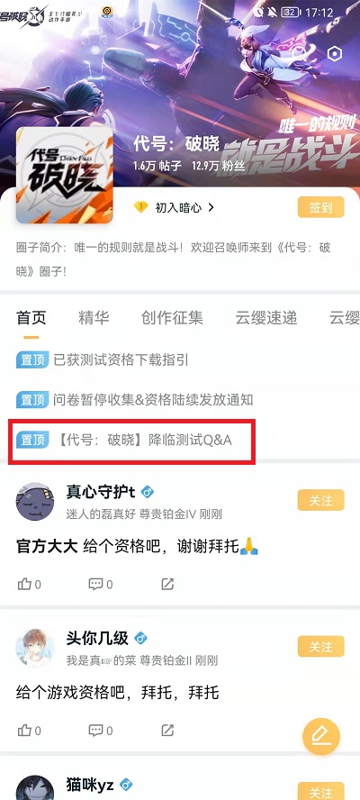 2、然后在圈子中就可以看到置顶的一个测试消息,点击进入其中就可以看到内测资格调查,填写问卷就可以参与内测,被抽中内测资格后就可以进入游戏。